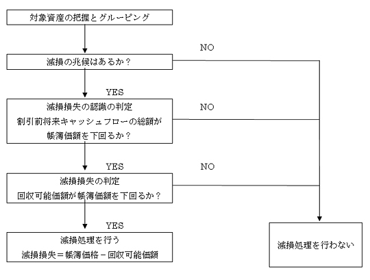 減損とは資産の収益性の低下により投資額の回収が見込めなくなった状態である。このような事態に立ち至った場合は回収可能見込価額まで帳簿価格を減額しなければならない。この評価減あるいは評価のやり直しが減損処理である。細部の詳細は省略するがその流れは下記の通りである。
